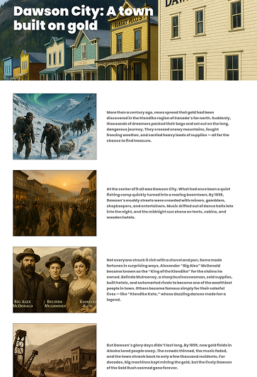 But Dawson’s glory days didn’t last long. By 1899, new gold fields in Alaska lured people away. The crowds thinned, the music faded, and the town shrank back to only a few thousand residents. For decades, big machines kept mining the gold, but the lively Dawson of the Gold Rush seemed gone forever.More than a century ago, news spread that gold had been discovered in the Klondike region of Canada’s far north. Suddenly, thousands of dreamers packed their bags and set out on the long, dangerous journey. They crossed snowy mountains, fought freezing weather, and carried heavy loads of supplies — all for the chance to find treasure.